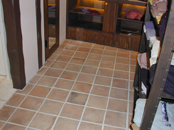 手つくり(ハンドメイドテラコッタ)を店舗に使いました。一枚一枚タイルの色が微妙に違い素焼きタイルの素朴な自然の風合いが、このフランス菓子店の欧風なイメージを高めています。